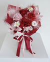 This bouquet features deep crimson preserved roses — the eternal symbol of love — paired with soft pink blooms, creamy white accents, and delicate feathery textures that create an elegant harmony between intensity and tenderness. Each bloom is meticulously preserved to maintain its velvety texture and vibrant color for years, making this arrangement a lasting reminder of cherished emotions.